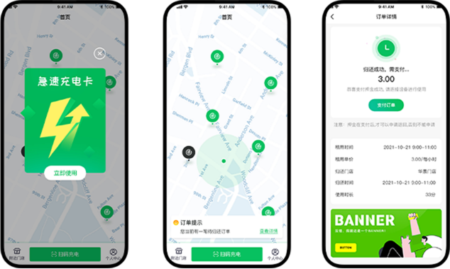 共享充电宝软件系统是指帮助企业搭建能够提供充电租赁设备的 系统,用户使用移动设备扫描设备屏幕上的二维码,即可借走充 电宝,使用后需归还附近机柜,按使用时间计费;企业可通过后 台对设备进行运维管理,投放及运营管理。