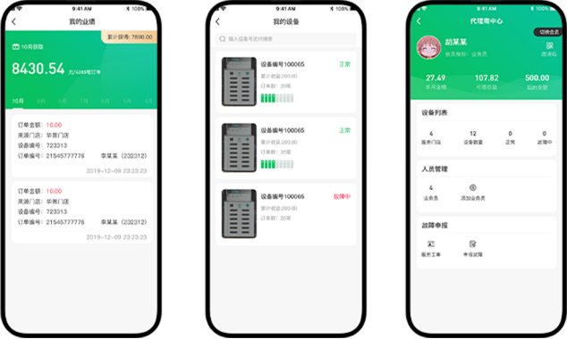共享充电宝代理端,包含设备管理、订单管理、 异常订单预警、设备报障、佣金记录等功能,赋 能渠道代理,提高管理效率,可视化的奖励机制 有效激励代理团队