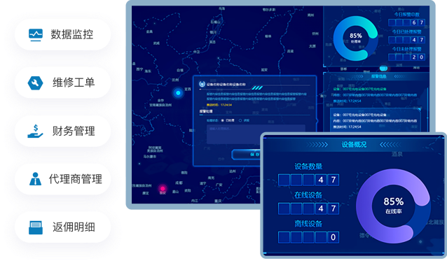 平台端不仅支持常规的售后工单管理、代理商管 理、佣金管理、设备管理,同时集成大数据看板, 基于投放及用户使用数据收集,分析城市特性和 城市用户画像,审核单店使用频率、人流量、订 单率、在线率、投资回报率以支撑平台高效运营