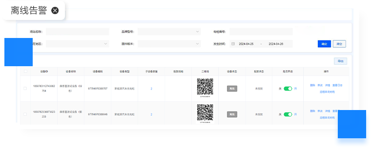 充电桩上传的充电异常及故障告警可以基于目标 条件快速筛选和导出,帮助运维人员分析使用
