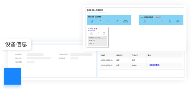 在设备管理中找到想要测试的充电桩,启动充电后进入 设备详情,点击查看实时数据即可监控该设备充电的实 时电流、电压、电量、温度,